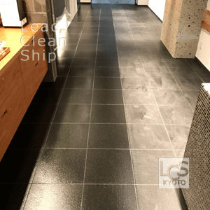 来月オープン予定のホテルのロビー床面に敷かれた御影石に保護剤を塗布するテストを行いました。